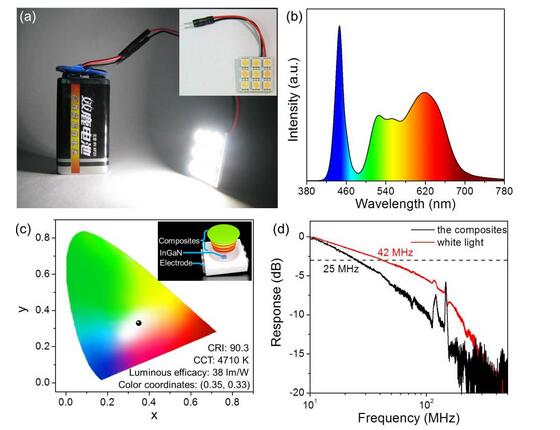 (a)白光光源的照片、(b)發(fā)光光譜以及(c)色坐標(biāo)。(d)基于半導(dǎo)體量子點光通訊器件帶寬測試曲線。