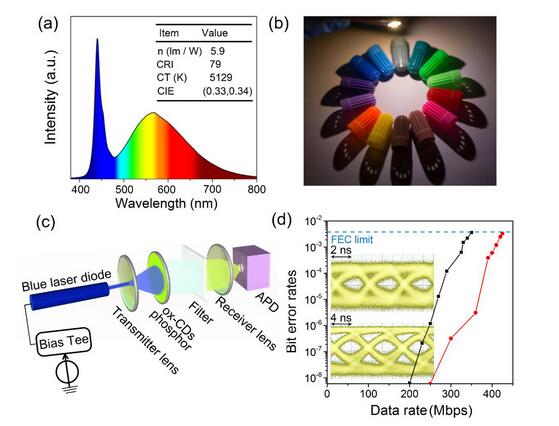 (a,b)基于ox-CDs熒光粉制備的白光器件,(c)光通訊系統(tǒng)的光路示意圖,(d)信號傳輸速率測試。