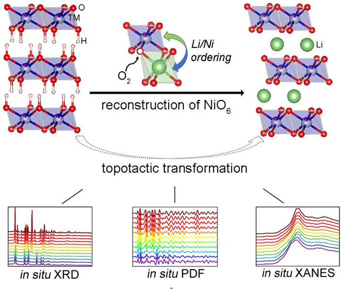 在高Ni層狀材料中存在著獨(dú)特的Li/Ni無(wú)序的現(xiàn)象,即,部分Li+離子占據(jù)了過(guò)渡金屬(TM)層的3a位,而部分Ni2+離子占據(jù)了Li層的3b位。Ni2+在Li層的存在會(huì)極大阻礙了Li+離子的在充放電過(guò)程中的脫出和插入,從而降低材料的實(shí)際容量。因此,Li/Ni無(wú)序被認(rèn)為是導(dǎo)致高Ni材料實(shí)際容量低的重要原因之一。長(zhǎng)久以來(lái),Li/Ni無(wú)序在合成過(guò)程中何時(shí)發(fā)生,為什么發(fā)生,這些疑問一直沒有得到解答。