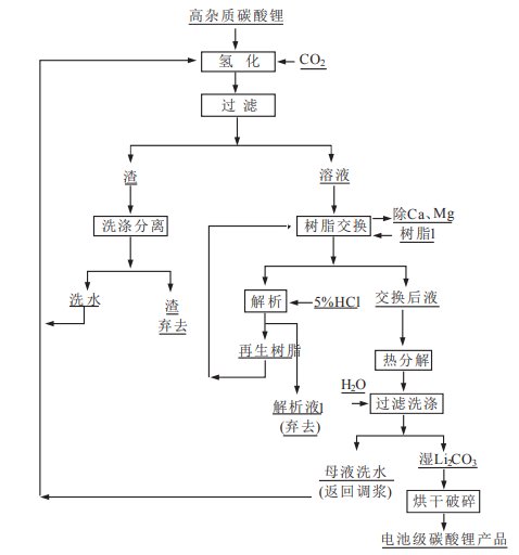 將粗級Li2CO3與水按一定固液比配成漿料,向漿料中通入CO2將其氫化,使微溶的Li2CO3轉(zhuǎn)變?yōu)榭扇苄缘腖iHCO3,然后將LiHCO3溶液泵入陽離子交換樹脂柱,將過柱后的溶液加熱分解脫去CO2氣體,Li2CO3從溶液中重新析出晶體。再經(jīng)過濾洗滌,烘干得到高純Li2CO3產(chǎn)品。實驗流程如下圖