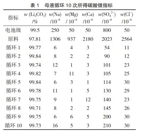 由于碳酸鋰是微溶物質(zhì),20℃下碳酸鋰的溶解度是1.33g•(100g水)-1,所以分解后的母液里含有約2.5g•L-1未析出的鋰,直接排放會造成鋰的損失,影響鋰的收率。為此設(shè)計母液循環(huán)實驗,將第一次分解后的母液返回氫化工序,進行第二次氫化,第二次分解后的母液返回進行第三次氫化,如此循環(huán)下去。母液循環(huán)10次后所得碳酸鋰產(chǎn)品指標見表1。