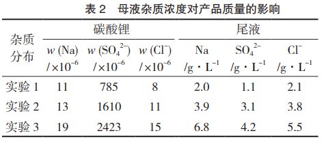 由表1可知,母液循環(huán)10次后所得的碳酸鋰純度高,完全滿足電池級碳酸鋰的要求。工業(yè)碳酸鋰原料除了含Ca和Mg外,雜質(zhì)含量較高的主要是Na、SO42-和Cl-,為了確定母液開路時雜質(zhì)濃度的控制點,特設(shè)計一組實驗。取氫化液6000mL,分成3份,分別向氫化液中添加不同量的Na、SO42-、Cl-雜質(zhì)離子,考察母液雜質(zhì)離子濃度對產(chǎn)品質(zhì)量的影響,結(jié)果如表2所示。