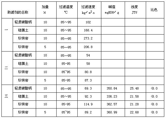 根據(jù)生產(chǎn)中過濾工藝條件進(jìn)行試驗,將半成品加熱升溫到900C~1000C加入定量的助濾劑過濾,然后對比過濾同等量濾液的時間,以下是各種助濾劑的過濾速度。具體試驗結(jié)果見表。