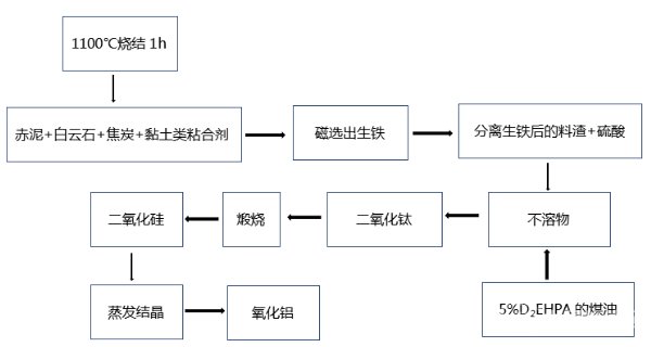 是將熔融、酸溶和萃取相結(jié)合實(shí)現(xiàn)氧化鋁的回收。該法可以綜合提取生鐵、二氧化鈦和氧化鋁。