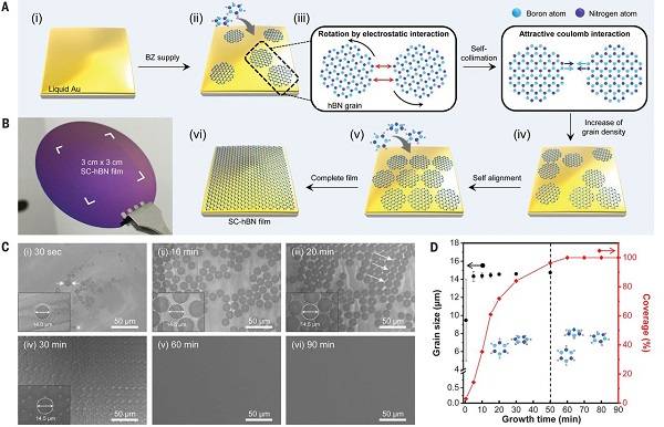 中國粉體網(wǎng)訊 今日,來自韓國成均館大學(xué)的Young Hee Le,東國大學(xué)的Ki Kang Kim以及KIST研究院的Soo Min Kim(共同通訊)聯(lián)合在Science上發(fā)表文章,題為“Wafer-scale single-crystal hexagonal boron nitride film via self-collimated grain formation”。作者報道了一種通過化學(xué)氣相沉積合成晶片級單晶hBN (SC-hBN)單層膜的方法。硼(B)和氮(N)原子在液態(tài)金中的有限溶解度促進了高溫下原子在液體表面的高度擴散,從而產(chǎn)生圓形hBN顆粒。這些晶粒通過晶粒間靜電相互作用所形成的B和N邊的自準直進一步演化為緊密排列的密堆積晶粒,最終在晶圓尺度上形成SC-hBN薄膜。這種SC-HBn膜還能夠合成晶片級石墨烯/ hBN質(zhì)結(jié)構(gòu)和單晶二硫化鎢。