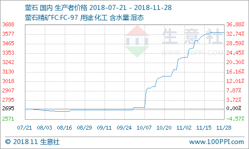 據(jù)統(tǒng)計,近期國內(nèi)螢石價格價格維持歷史高位,截止28日國內(nèi)螢石均價為3595.83元/噸,創(chuàng)下歷史新高價格。由于環(huán)保嚴(yán)查的影響,近期國內(nèi)部分螢石裝置停車,場內(nèi)礦山和浮選裝置停車檢修,場內(nèi)螢石供應(yīng)相對減少,螢石價格價格近期維持高位。加之隨著氣溫的降低,北方螢石浮選裝置將會不斷停車,更是加劇國內(nèi)螢石供應(yīng)緊張的情況,南方螢石市場裝置開工方面也有所減少,場內(nèi)螢石供應(yīng)十分緊張,部分下游廠家反映出現(xiàn)有錢買不到貨的情況,南方地區(qū)螢石市場價格走高。截止28日內(nèi)蒙古地區(qū)97螢石濕粉價格在3400-3700元/噸,福建地區(qū)97螢石濕粉商談主流在3500-3800元/噸,河南地區(qū)97螢石濕粉價格在3600-3800元/噸,江西地區(qū)97螢石濕粉價格在3500-3800元/噸,根據(jù)場內(nèi)人士反映部分商家出現(xiàn)3850元/噸送到成交的高位,螢石價格處于高位水平。