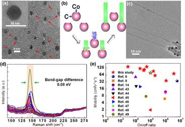 圖2:(a)部分涂覆了碳的Co納米顆粒的TEM圖像,表明納米顆粒是單分散和尺寸均勻的。紅色箭頭表示Co納米顆粒部分地被碳層包覆。(b)顯示窄帶隙分布的半導體單壁碳納米管受控生長機制的示意圖。(c)所制備的單壁碳納米管的TEM圖像。(d)用532nm激光測量SWCNT的拉曼光譜。(e)將SWCNT薄膜晶體管的電性能與之前的報告進行比較。