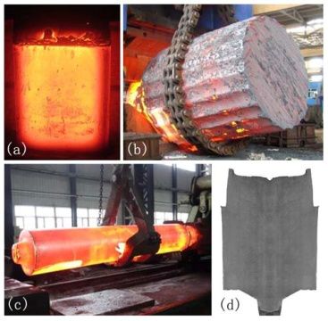 圖3:(a)60t特種板(厚度900mm,W:2.7m,H:3.6m)。(b)600t大錠(D:4.3m,H:7.6m)。(c)高度/直徑比高的鑄坯(D:800毫米,H:4.5m)。(d)100t高均勻鑄錠(D:2.4m,H:3.6)。