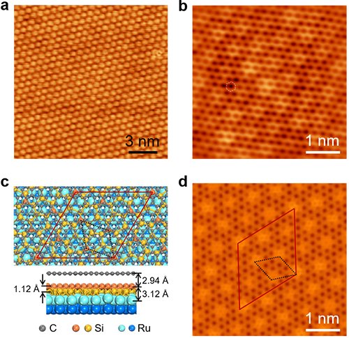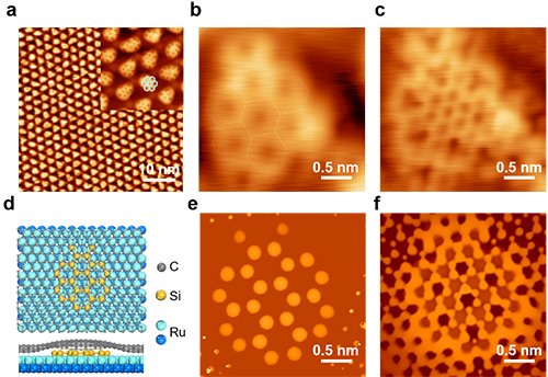圖1. 在石墨烯/Ru(0001)界面處的硅烯結構形成示意圖。在退火過程中,沉積的Si原子插入到石墨烯和Ru基底之間。沉積量較小時,Si原子在石墨烯摩爾斑圖atop區(qū)域(隆起的區(qū)域)下方形成蜂窩狀硅烯納米薄片。隨著Si沉積量的增加,插層結構形成硅烯單層結構。