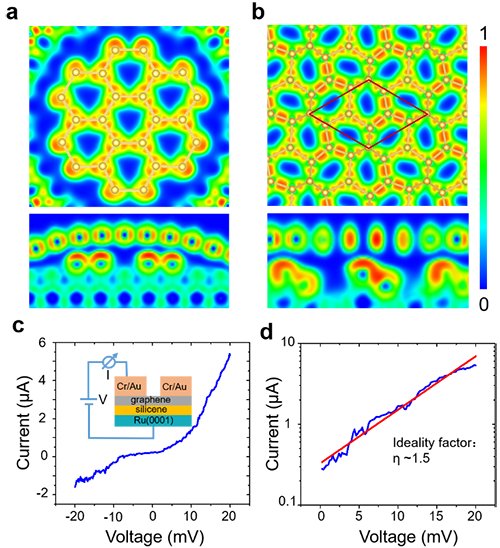 圖4. 石墨烯/硅烯異質結構的電子局域函數(shù)(ELF)計算和輸運特性。(a,b)硅烯納米片和單層硅烯在硅原子平面的電子局域函數(shù)(ELF)分布圖。c)在105 K下測量的石墨烯/硅烯/釕垂直異質結構的電流-電壓曲線,顯示典型的肖特基型整流行為。插圖是器件結構和測量的示意圖。 d)伏安曲線的對數(shù)圖。通過將其與Schockley模型擬合得到的理想因子為1.5。