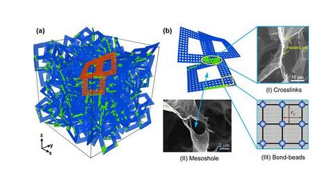 近期,中國科學(xué)院合肥物質(zhì)科學(xué)研究院先進(jìn)制造技術(shù)研究所仿生機器人與智能材料實驗室研究員王曉杰團(tuán)隊博士潘斗興與中科院力學(xué)研究所博士王超合作,通過細(xì)致研究石墨烯泡沫鉸鏈和缺陷的SEM鏡像,在準(zhǔn)二維石墨片模型基礎(chǔ)上,成功構(gòu)建了一種同時含有本征孔和鉸鏈鍵的三維孔片網(wǎng)絡(luò)拓?fù)淠P。他們通過引入鉸鏈鍵力場參數(shù)和孔片比特征幾何量,借助粗粒化動力學(xué)方法,合理地實現(xiàn)了對擬真實石墨烯泡沫力學(xué)行為的有效評估。