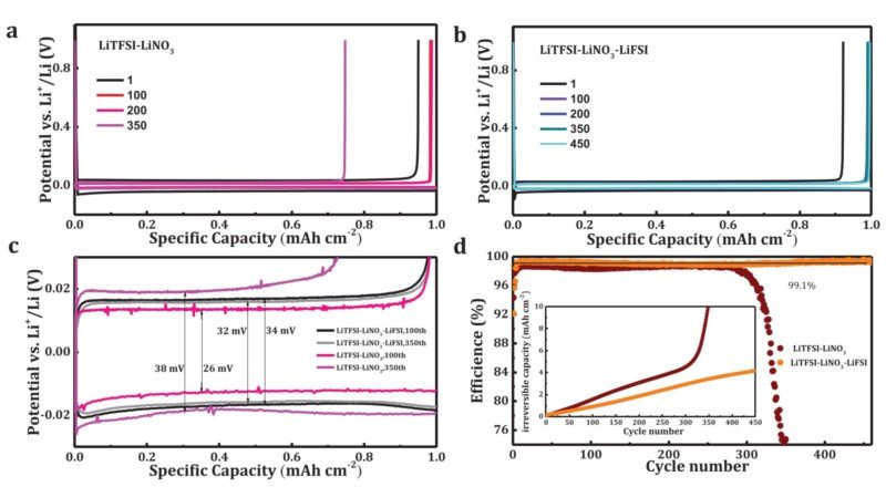 圖一:金屬鋰負(fù)極充放電曲線圖a)雙鹽電解液 b)三鹽電解液。c)電極在循環(huán)過(guò)程中的過(guò)電位。d)每圈的庫(kù)倫效率以及累積的不可逆容量。