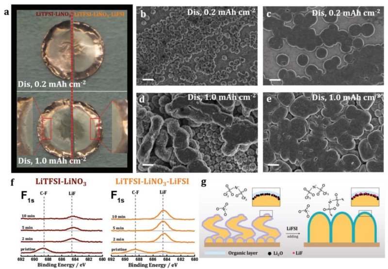 圖二:a)兩種電解液中不同沉積容量的電極的光學(xué)照片。沉積容量為0.2 mAh cm2時(shí)的掃描電鏡圖片:b)雙鹽電解液 c)三鹽電解液。沉積容量為1.0 mAh cm2時(shí)的掃描電鏡圖片:d)雙鹽電解液 e)三鹽電解液。 f) 不同電解液中SEI膜的F1s能譜。 g)添加LiFSI后的鋰生長(zhǎng)示意圖。