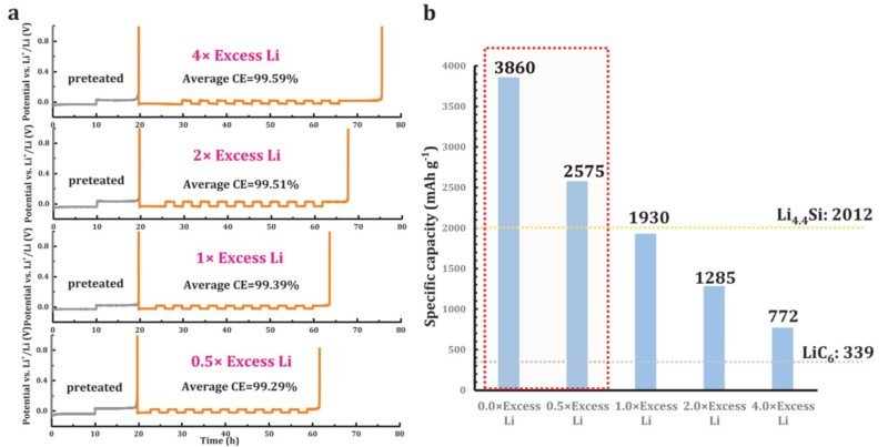 圖三:不同過(guò)量鋰條件下的鋰負(fù)極庫(kù)倫效率和比容量。