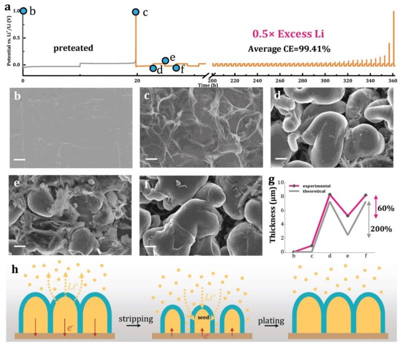 圖四:a) 0.5倍過(guò)量鋰下的長(zhǎng)循環(huán)性能。b-f)不同階段的掃描電鏡圖片。g)沉積的鋰的厚度。h)循環(huán)過(guò)程示意圖。