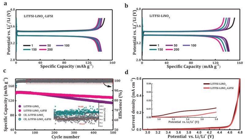 圖五:鋰金屬-磷酸鐵鋰半電池的充放電曲線圖a)雙鹽電解液。 b)三鹽電解液。c)不同電解液中電池的循環(huán)穩(wěn)定性。d)線性掃描伏安曲線。