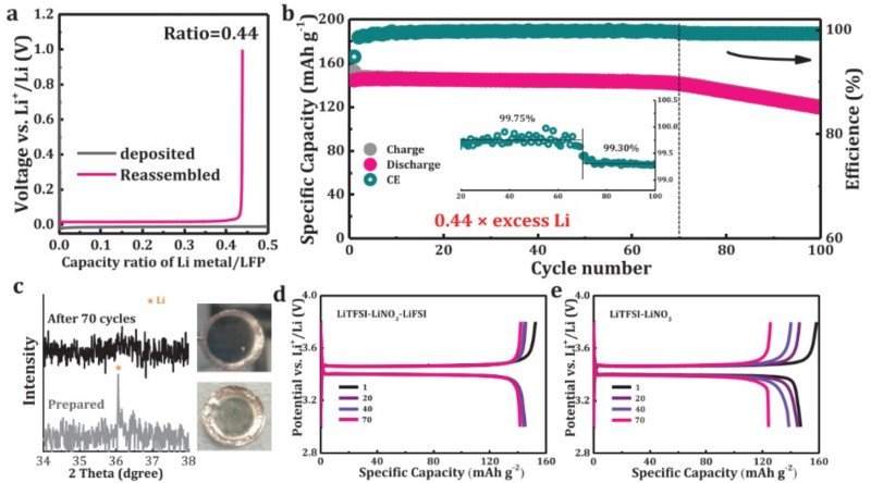 圖六:a)拆-裝電池后電極上剩余的活性鋰金屬。b)0.44倍鋰過(guò)量下全電池的循環(huán)壽命和庫(kù)倫效率。c)電極的XRD和光學(xué)照片。金屬鋰-磷酸鐵鋰全電池的充放電曲線圖:d)雙鹽電解液 e)三鹽電解液。