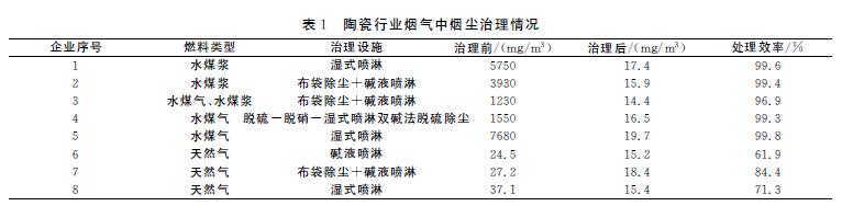 陶瓷行業(yè)廢氣中煙塵來源主要是生產(chǎn)制造過程中產(chǎn)生的顆粒物以及水煤氣、水煤漿燃燒產(chǎn)生的煙塵。表1選取了此次監(jiān)測中較為典型的8家陶瓷企業(yè)進行對比分析,從治理前后的數(shù)據(jù)可知,用水煤漿、水煤氣為燃料的企業(yè),治理前煙塵含量明顯高于天然氣為燃料的企業(yè),各家企業(yè)通過投用除塵技術后,均能有很好的除塵效率,處理后煙塵濃度明顯降低。