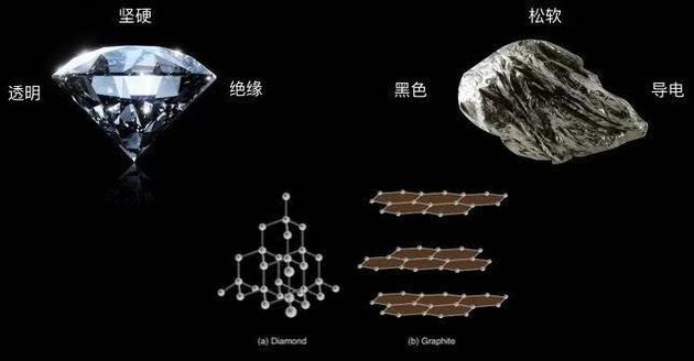 鉆石顏值很高,價格很貴,它透明、堅硬、絕緣。相反,石墨是什么?它是黑色的、 松軟的、導(dǎo)電的,兩種材料完全相反,然而它們都是實實在在由碳組成的材料。