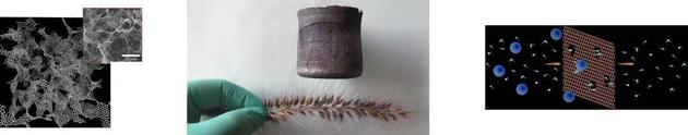 我們看中間這張圖,就是用石墨烯組成了一個泡沫狀的結(jié)構(gòu),它可以自己把自己支撐起來,但非常非常的輕。我們把它放在一個狗尾草上面,狗尾草看上去沒有任何的結(jié)構(gòu)上的變化。