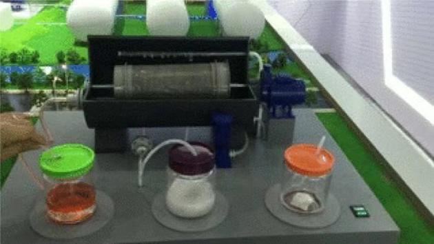 在我們最左邊的這幅圖里面是一個水、油、懸浮物混合的溶液,然后它進入這個機器以后分出來的中間的是純水或者處理后的比較干凈的水,右邊橘色的是油,另一個管道出現(xiàn)的是固態(tài)顆粒。右邊我們看到它可以做成一個整機,就可以真正地去處理水了。