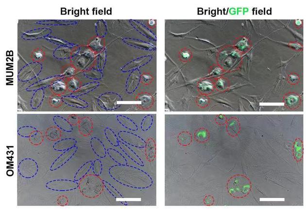 用石墨烯做的示蹤原子非常好,我們看左邊這個圖,用石墨烯看到的癌細胞是綠的,它不染色這個正常的細胞,我們就看到癌細胞是怎么變化的。