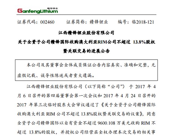 中國粉體網(wǎng)訊 近日,贛鋒鋰業(yè)發(fā)布公告稱,贛鋒國際已經(jīng)與此次交易的對手方Neometals 簽訂股權(quán)轉(zhuǎn)讓協(xié)議,贛鋒國際與澳大利亞RIM 公司的另一位股東PMI 將同時(shí)行使優(yōu)先認(rèn)購權(quán),雙方分別認(rèn)購Neometals 持有的13.8%的股權(quán)中的50%即6.9%的股權(quán),贛鋒國際將支付此次股權(quán)轉(zhuǎn)讓價(jià)款5190 萬澳元(約合人民幣2.5億元)。此次交易完成后,贛鋒國際持有RIM 50%的股權(quán)。