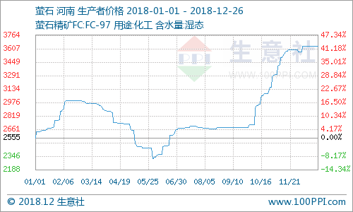 據(jù)生意社監(jiān)測(cè)數(shù)據(jù)顯示,2018年國內(nèi)螢石價(jià)格大幅上漲,年初平均價(jià)格為2555元/噸,年末國內(nèi)螢石均價(jià)為3633.33萬噸,全年漲幅為42.20%。由螢石價(jià)格走勢(shì)圖中可以清晰的看出,2018年國內(nèi)螢石價(jià)格最低價(jià)出現(xiàn)在5月30日,國內(nèi)均價(jià)為2320元/噸,國內(nèi)螢石價(jià)格最高價(jià)出現(xiàn)在年底,均價(jià)為3633.33元/噸,全年最大振幅為56.61%,全年市場(chǎng)價(jià)格大幅上漲,螢石價(jià)格達(dá)到歷史新高水平。