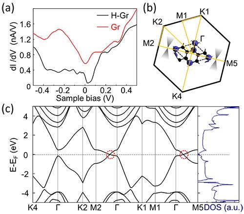 圖3. 晶態(tài)三分之一氫化石墨烯dI/dV譜及DFT計(jì)算的能帶結(jié)構(gòu)與態(tài)密度圖。