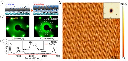 圖1. 厘米尺寸晶態(tài)三分之一氫化石墨烯的制備示意圖、LEED、Raman光譜和大面積STM圖像。