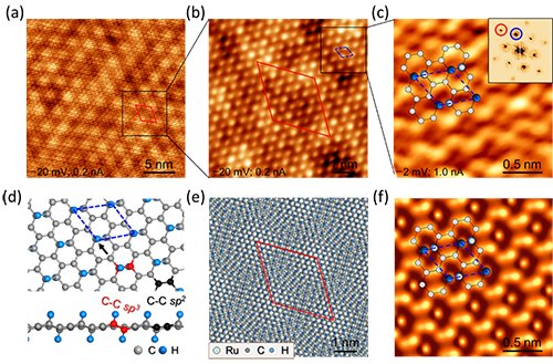 圖2. 晶態(tài)三分之一氫化石墨烯高分辨STM圖、結(jié)構(gòu)模型及STM模擬。