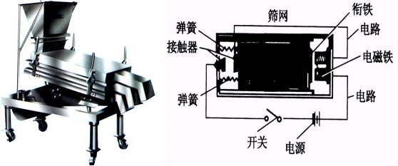 電磁振動(dòng)篩粉機(jī)的原理是利用較小的振幅0.5~1和較大的頻率每分鐘3000~6000次來產(chǎn)生振動(dòng)力,主要由電磁鐵、篩網(wǎng)、銜鐵、彈簧、接觸器等部分組成,篩內(nèi)支架上安裝有滑軌,在篩的邊框上支撐著電磁震動(dòng)裝置,使篩網(wǎng)沿滑軌往復(fù)運(yùn)動(dòng)。物料從篩的高端加入,粗料由篩網(wǎng)上面的下端口排出,細(xì)料從篩網(wǎng)下面排出。