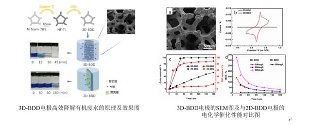 該團(tuán)隊(duì)在國(guó)際上首次采用化學(xué)氣相沉積(CVD)技術(shù)在泡沫鎳上構(gòu)建具有三維網(wǎng)絡(luò)大孔結(jié)構(gòu)的BDD泡沫電極,相較于同尺寸封閉型二維平板電極,BDD泡沫電極不僅電化學(xué)有效活性面積提升了20倍,而且分布均勻、尺寸可調(diào)的三維網(wǎng)絡(luò)孔洞結(jié)構(gòu)可供廢水自由流通,極大地加速了液相與電極表面的對(duì)流,提升了液相的傳質(zhì)速率。“大比表面積+高傳質(zhì)速率”的協(xié)同效應(yīng),極大地提高電極的降解效率,在2.4mA/cm2的小電流密度下,BDD泡沫電極電化學(xué)降解活性藍(lán)19僅1h移出率就超過95%、礦化率超過80%。BDD泡沫電極電化學(xué)性能優(yōu)異,制備方法簡(jiǎn)單可重復(fù),空間利用率高,將若干個(gè)BDD泡沫電極組裝在一起,可形成一個(gè)質(zhì)量輕、占地面積小、效率高、能耗低的實(shí)際廢水處理裝置,在難降解有機(jī)廢水領(lǐng)域具有十分廣闊的應(yīng)用前景。此外,BDD泡沫電極成功制備也將有利于推進(jìn)金剛石在電催化、電合成、電化學(xué)傳感、超級(jí)電容等領(lǐng)域的應(yīng)用。