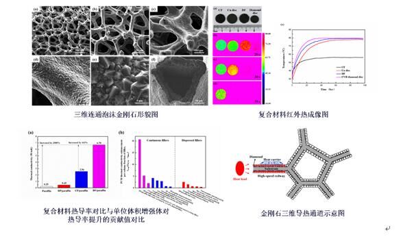 潛熱儲(chǔ)能通過材料發(fā)生相變時(shí)吸收或釋放大量熱量,實(shí)現(xiàn)能量的儲(chǔ)存和利用,可有效地解決能量供求在空間和時(shí)間上不匹配的矛盾,近年來(lái)已成為能源存儲(chǔ)和利用領(lǐng)域的研究熱點(diǎn)。但潛熱儲(chǔ)能材料普遍存在熱導(dǎo)率低、換熱性能差等缺點(diǎn),極大限制了其廣泛應(yīng)用和發(fā)展。該團(tuán)隊(duì)首次將高質(zhì)量泡沫金剛石引入到相變材料中,通過在石蠟相變材料中構(gòu)建三維連通的金剛石快速導(dǎo)熱通道,將熱導(dǎo)率從0.25 W/mK提高到6.7W/mK,比石蠟提高了25.8倍。而且,與石墨、碳納米管、石墨烯等高導(dǎo)熱碳材料,泡沫金剛石無(wú)明顯的導(dǎo)熱各向異性,復(fù)合材料單位體積增強(qiáng)體對(duì)熱導(dǎo)率的貢獻(xiàn)值處于同領(lǐng)域領(lǐng)先水平。