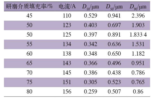 研磨介質(zhì)填充率越大,研磨介質(zhì)接觸頻率就越大;從粒徑可以看出,在相同研磨時(shí)間內(nèi)產(chǎn)品粒徑就越小,研磨的效果就好。但在實(shí)際生產(chǎn)過程中,還要考慮研磨介質(zhì)的填充率增加電流也會(huì)增大,同時(shí)會(huì)對設(shè)備本體存在磨損嚴(yán)重的現(xiàn)象,經(jīng)過長期的生產(chǎn)經(jīng)驗(yàn)積累,研磨介質(zhì)的填充率控制在65%~75%時(shí),研磨效果較好,同時(shí)對設(shè)備磨損較小。