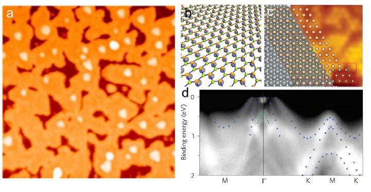 2015年,Zhu等人利用分子束外延生長(zhǎng)技術(shù)在半導(dǎo)體三碲化二鉍(Bi2Te3)基底上構(gòu)筑了錫烯二維晶體薄膜。如圖1所示,結(jié)合STM和DFT,他們證實(shí)了外延錫烯薄膜的低度翹曲雙原子層結(jié)構(gòu)。角分辨光電子能譜表征發(fā)現(xiàn)了錫烯薄膜的能帶結(jié)構(gòu)有空穴口袋(Hole Pockets)的特點(diǎn),結(jié)合Bi2Te3基底的Rashba效應(yīng),使錫烯二維晶體薄膜有機(jī)會(huì)成為拓?fù)涑瑢?dǎo)體。單層錫烯薄膜的制備,對(duì)在實(shí)驗(yàn)上研究二維拓?fù)潆娮訉W(xué)材料起到重要的推動(dòng)作用。