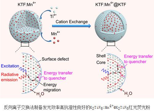 在中國科學(xué)院戰(zhàn)略性先導(dǎo)科技專項(xiàng)、中科院創(chuàng)新國際團(tuán)隊、中科院青促會以及海西研究院春苗計劃等支持下,中科院福建物質(zhì)結(jié)構(gòu)研究所功能納米結(jié)構(gòu)設(shè)計與組裝重點(diǎn)實(shí)驗(yàn)室朱浩淼研究小組與陳學(xué)元研究小組合作,巧妙地利用一種快速的反向離子交換法對K2TiF6:Mn4+材料表面進(jìn)行處理,成功制備出具有核殼結(jié)構(gòu)的K2TiF6:Mn4+@K2TiF6紅光熒光粉。該材料表面形成的惰性K2TiF6殼層不僅能通過阻擋內(nèi)層的Mn4+離子與水的接觸來提高抗?jié)裥阅,還能有效阻斷激發(fā)態(tài)能量向表面晶格缺陷遷移的通道,從而達(dá)到提高發(fā)光效率的目的。研究結(jié)果表明,進(jìn)行反向離子交換處理后,材料(摻雜濃度7 at.%樣品)的發(fā)光效率由75%提高到93%;在85℃/85%濕度老化480 h后,材料的發(fā)光強(qiáng)度保持率由45%提高到89%,表明材料的抗?jié)裥阅艿玫搅舜蠓嵘@肒2TiF6:Mn4+@K2TiF6紅色熒光粉與YAG:Ce3+黃色熒光粉封裝的暖白光LED器件在60 mA驅(qū)動電流條件下,色溫3510 K,顯色指數(shù)Ra = 93,流明效率高達(dá)162 lm W-1,為目前文獻(xiàn)報道的最高值。