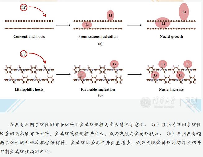 中國(guó)粉體網(wǎng)訊 近期,清華大學(xué)化工系張強(qiáng)課題組在《科學(xué)進(jìn)展》及《Research》上發(fā)表系列文章《摻雜碳材料親鋰性化學(xué)誘導(dǎo)鋰金屬均勻形核》(Lithiophilicity Chemistry of Heteroatom-Doped Carbon to Guide Uniform Lithium Nucleation in Lithium Metal Anodes)《親鋰卟啉有機(jī)骨架調(diào)控?zé)o枝晶金屬鋰負(fù)極的均勻形核》(Favorable Lithium Nucleation on Lithiophilic Framework Porphyrin for Dendrite-Free Lithium Metal Anodes),闡釋鋰金屬負(fù)極骨架親鋰化學(xué)及材料設(shè)計(jì)領(lǐng)域的研究取得重要進(jìn)展。