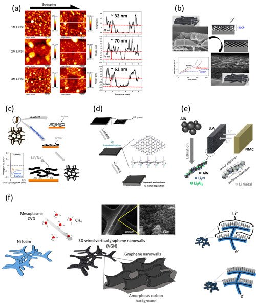 圖1(a)鋰金屬負極界面在不同鹽濃度下的界面表征;(b)一種用于鋰金屬界面保護的導向性雙層碳結構;(c)一種堆疊石墨烯實現的過濾型鋰金屬沉積保護模式;(d)一種碳缺陷位點的界面轉化實現SEI化的功能性鋰金屬保護層;(e)一種簡易制備的Li9Al4-Li3N-AlN結構作為高效的鋰金屬宿主結構;(f)一種垂直石墨烯結構實現的特殊界面鋰離子傳輸及鋰金屬均勻沉積。