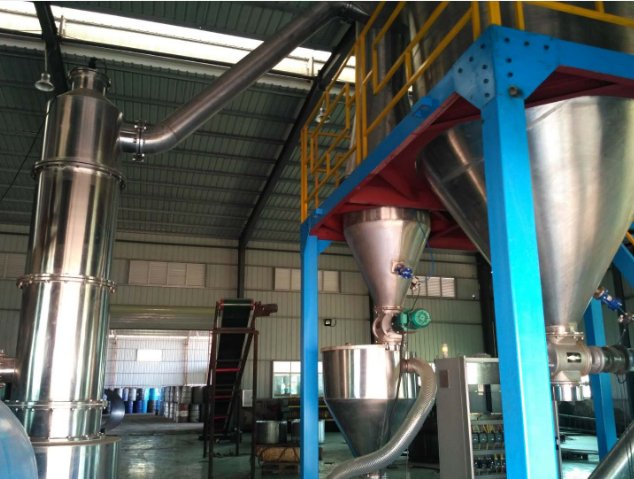 干粉隨氣流進(jìn)入旋風(fēng)收集器,成品由收集器底部出料排出,尾氣中夾帶的細(xì)粉通過脈沖布袋除塵器進(jìn)一步過濾分離,凈化后的尾氣由引風(fēng)機(jī)排除。旋轉(zhuǎn)式閃蒸干燥機(jī)具有適應(yīng)物料范圍廣,能處理膏狀濾餅,生產(chǎn)能力大,連續(xù)密閉操作以及干燥物料一次成粉等優(yōu)點(diǎn)。由于設(shè)計(jì)了獨(dú)特的破碎機(jī)構(gòu)和進(jìn)料裝置,使得物料在干燥器內(nèi)能以最短時(shí)間分散,強(qiáng)化了傳熱效果,使熱效率達(dá)65%。