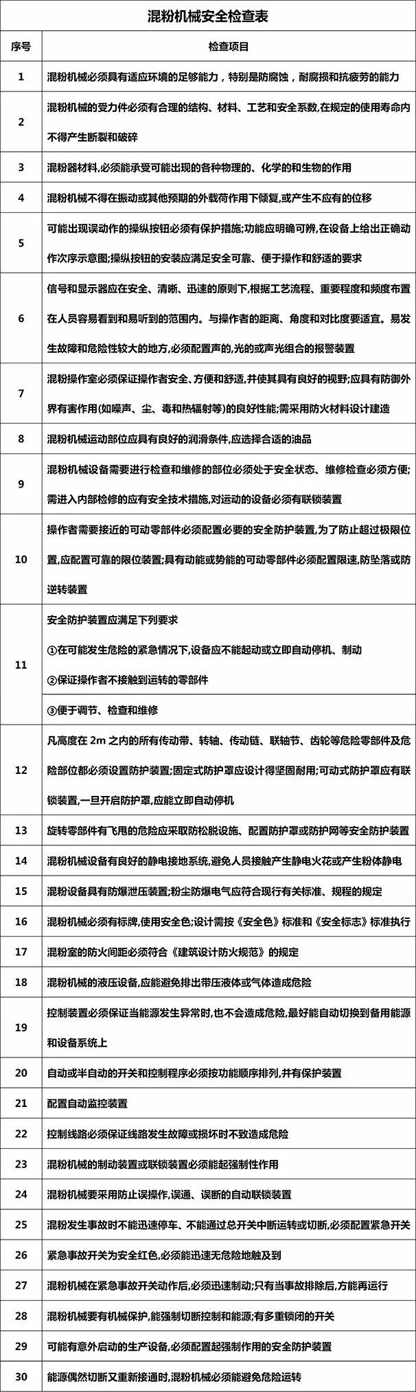 針對(duì)該類較強(qiáng)爆炸特性藥粉的生產(chǎn)企業(yè)的混粉機(jī)械裝置,研究者編制和設(shè)計(jì)了安全檢查表,此安全檢查表的設(shè)計(jì)系統(tǒng)綜合考慮了各種因素的影響,判定和檢查危險(xiǎn),具有較強(qiáng)的針對(duì)性,嚴(yán)格安全檢查,達(dá)到檢查表中的各項(xiàng)規(guī)程,從而形成系統(tǒng)化管理。