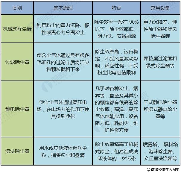 根據(jù)工作原理分類,除塵器可分為靜電式除塵器、袋式除塵器、濕式除塵器及旋風(fēng)除塵器等。其中,靜電式除塵器除塵效率高、運行費用較低,但設(shè)備龐大、占地面積大,設(shè)備制造、安裝、維護(hù)要求高、對粉塵的特性較為敏感;袋式除塵器除塵效率也高,使用靈活,結(jié)構(gòu)簡單,投資小,但維護(hù)成本較高;濕式除塵器效率比干式高,處理高溫高濕及黏性大的粉塵,結(jié)構(gòu)簡單,一次投資小,但不適用于憎水性和水硬性粉塵,防冬季結(jié)冰;旋風(fēng)除塵器結(jié)構(gòu)簡單,維護(hù)方便。