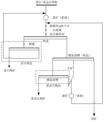 本發(fā)明公開了一種分步回收螢石和重晶石的方法,方法分為螢石浮選回收和重晶石重選回收;其中螢石浮選回收方法為將礦石粗磨至大部分螢石單體解離,加入水玻璃,再加入螢石捕收劑進(jìn)行粗選至充分作用,將泡沫產(chǎn)品刮出作為螢石粗精礦,螢石粗精礦精選后得到螢石精礦;將螢石的浮選尾礦采用螺旋溜槽進(jìn)行重晶石的分離,螺旋溜槽的精礦為重晶石粗精礦,重晶石粗精礦再用螺旋溜槽精選后作為重晶石精礦產(chǎn)品,精選尾礦與螺旋溜槽中礦進(jìn)入再磨后返回螢石粗選作業(yè);本發(fā)明方法可以實(shí)現(xiàn)螢石和重晶石有效的分離,工藝簡單,螢石分選采用重選,能耗少且經(jīng)濟(jì)環(huán)保;所述的螢石捕收劑對螢石具有較強(qiáng)的捕收能力和較好的選擇性,不需要再加入重晶石的抑制劑,操作更簡單。