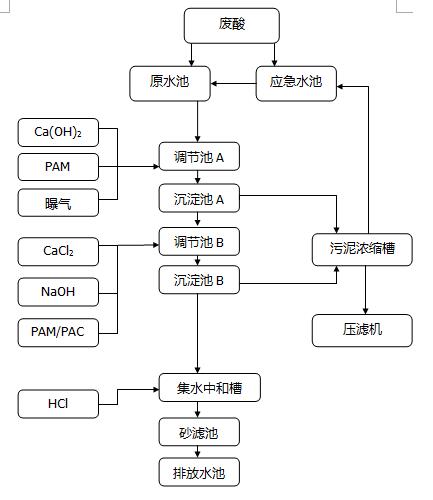 (7) 應(yīng)急水池說(shuō)明: 在非正常運(yùn)行下,導(dǎo)致無(wú)法進(jìn)行正常污水處理時(shí),原廢酸溶液可直排應(yīng)急水池,做過(guò)度使用池。另外,在廢酸處理的過(guò)程中,不達(dá)標(biāo)廢水亦可以排入應(yīng)急水池,做應(yīng)急處理。