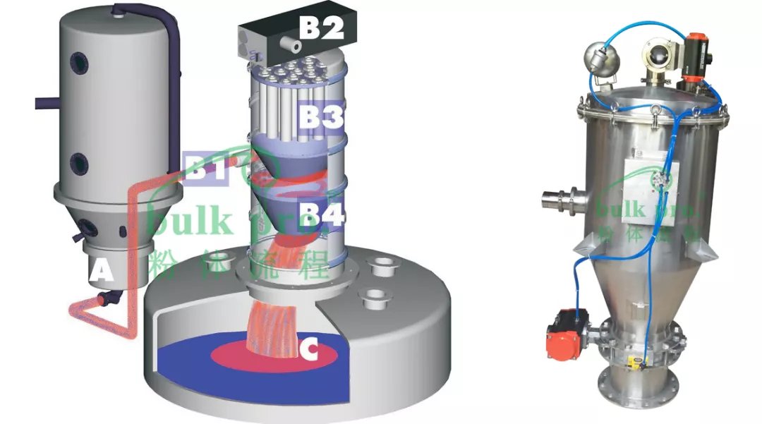 ★ 在分離容器的過濾倉內(nèi)分離空氣與物料,將物料收集在料倉中,旋風(fēng)分離器阻止細(xì)小粉未進(jìn)入過濾器B3,以提高過濾器的效率;