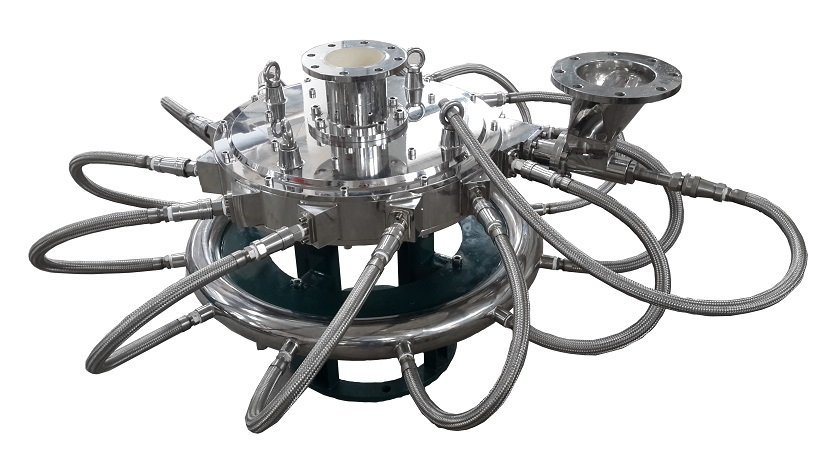 一種早期開(kāi)發(fā)的氣流粉碎機(jī),是一種利用顆粒間及顆粒與粉碎腔的內(nèi)壁的碰撞、剪切、摩擦而實(shí)現(xiàn)粉碎的設(shè)備。它的主要部件是一個(gè)圓盤(pán)粉碎腔,布置在噴射環(huán)上與粉碎腔平面成一定角度的若干個(gè)(6~24個(gè))高壓工質(zhì)噴嘴,噴射式加料器、成品捕集器等。