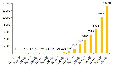 2000-2017年全球石墨烯專利申請數量情況(單位:件)