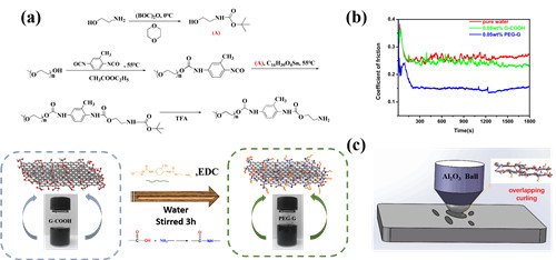 圖1 (a) PEG-G合成示意圖,(b) PEG-G作為水基潤滑添加劑的摩擦系數(shù),(c) 潤滑機理圖 來源中國科學(xué)院