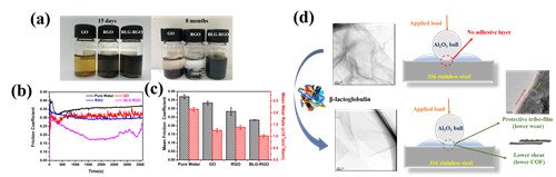 另外,該團隊利用具有吸附性的β-乳球蛋白(BLG)作為剝離劑和分散劑修飾還原氧化石墨烯(RGO),蛋白質(zhì)可與RGO殘余的氧化基團產(chǎn)生氫鍵,其憎水基團可與RGO表面產(chǎn)生相互作用,親水基團朝向水相從而促使還原氧化石墨烯可在水中穩(wěn)定分散達8個月。由于蛋白質(zhì)在金屬表面固有的吸附性能,BLG-RGO可在摩擦副表面形成穩(wěn)定的吸附層,在摩擦前期阻礙摩擦副的接觸并阻止水和水中溶解的氧氣對摩擦副的腐蝕。在摩擦過程中,石墨烯的片層結(jié)構(gòu)使其具有較低的摩擦系數(shù),并且吸附層嵌入磨痕中,形成摩擦膜,降低其磨損率。BLG-RGO作為水基潤滑添加劑具有優(yōu)異的潤滑性能和緩蝕性能,其摩擦系數(shù)降低37%,磨損率降低45%,緩蝕效率達92%。相關(guān)工作發(fā)表在Tribology International, 2019, 135, 277-286,并申請了國家發(fā)明專利(CN 108517238A)。