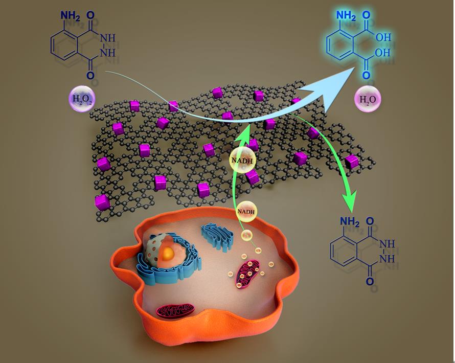 與此同時(shí),研究人員還采用該方法制備出多孔石墨烯/氧化亞銅復(fù)合材料以及單純的氧化亞銅納米立方體。研究表明,該復(fù)合材料具有顯著的類過(guò)氧化物酶活性,能夠催化雙氧水氧化魯米諾產(chǎn)生強(qiáng)烈的化學(xué)發(fā)光。但在還原型煙酰胺腺嘌呤二核苷酸(NADH)存在的情況下,體系的化學(xué)發(fā)光強(qiáng)度會(huì)受到明顯的抑制。受到這一現(xiàn)象的啟發(fā),構(gòu)建了一種高選擇性、高靈敏度檢測(cè)NADH的化學(xué)發(fā)光傳感新策略(圖2)。該策略可用于人血清和A549細(xì)胞裂解液中NADH的定量檢測(cè),且實(shí)驗(yàn)結(jié)果與電流傳感器和液相色譜結(jié)果完全吻合。相關(guān)結(jié)果在線發(fā)表于Sensors & Actuators: B. Chemical,2019,DOI: org/10.1016/j.snb.2019.03.106。